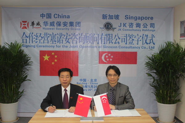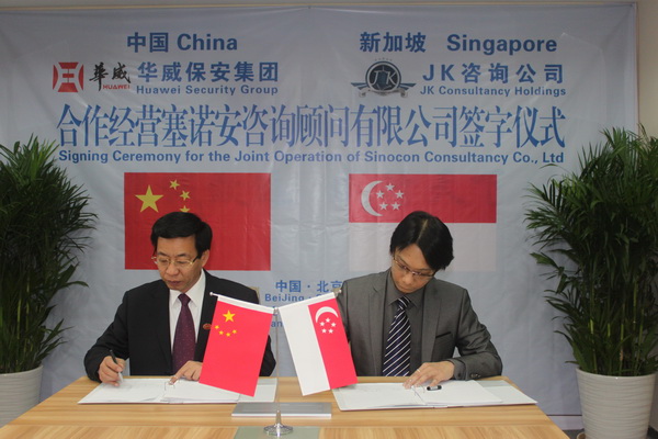 山東華威保安集團(tuán)與新加坡JK咨詢控股公司合作經(jīng)營(yíng)北京塞諾安咨詢顧問有限公司協(xié)議在北京簽訂。