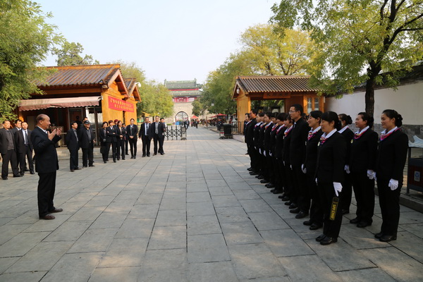 匯報結(jié)束后,與會人員驅(qū)車共同到曲阜分公司齊魯理工學(xué)院、三孔景區(qū)、曲阜市政府、濟寧學(xué)院四個基層企業(yè)文化建設(shè)示范點進行了現(xiàn)場觀摩。隊員們?yōu)榇蠹已菔玖私唤影?、接待來訪人員、安檢等標(biāo)準(zhǔn)操作程序。在三孔景區(qū),20名英姿颯爽的女保安隊員身著嶄新的制服為大家表演了隊列練習(xí)、檢票入場程序并背誦了《論語》,她們精彩的示范表演贏得了大家陣陣掌聲,同時大家對示范點的軟硬件建設(shè)都做了認真的記錄和拍照。