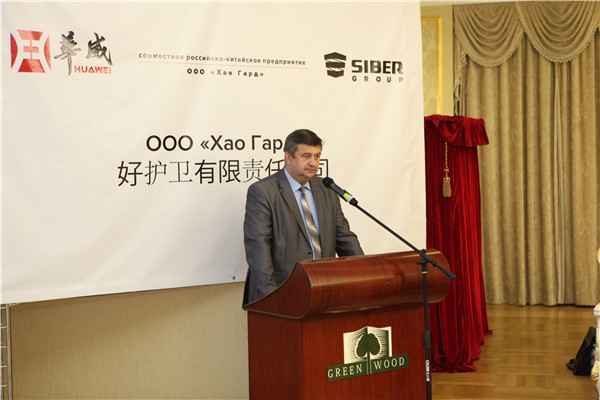 在成立揭牌儀式上,山東華威保安集團(tuán)董事長荀金慶、俄技集團(tuán)西貝爾公司總經(jīng)理符拉迪米爾.卡皮絲、好護(hù)衛(wèi)公司總經(jīng)理伊戈?duì)柗謩e致辭。警務(wù)參贊朱榮輝、世界警察協(xié)會副會長阿里克謝.甘克因分別致賀辭,對好護(hù)衛(wèi)公司的成立表示祝賀。格林伍德園區(qū)、深圳九龍科技發(fā)展有限公司分別與好護(hù)衛(wèi)公司簽訂了合作意向書。